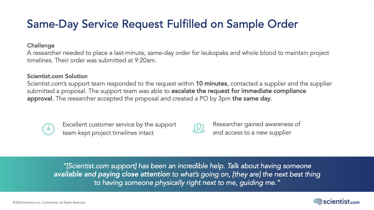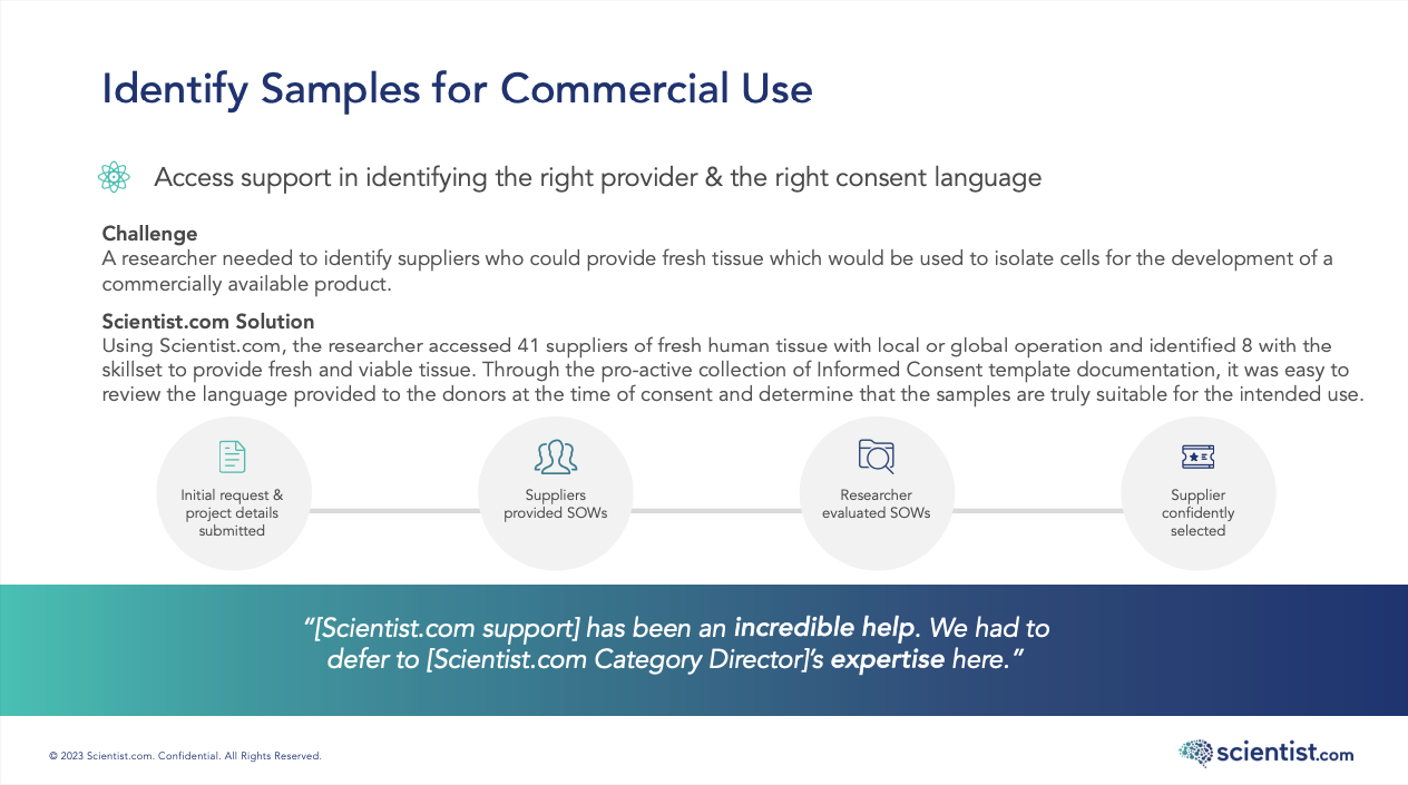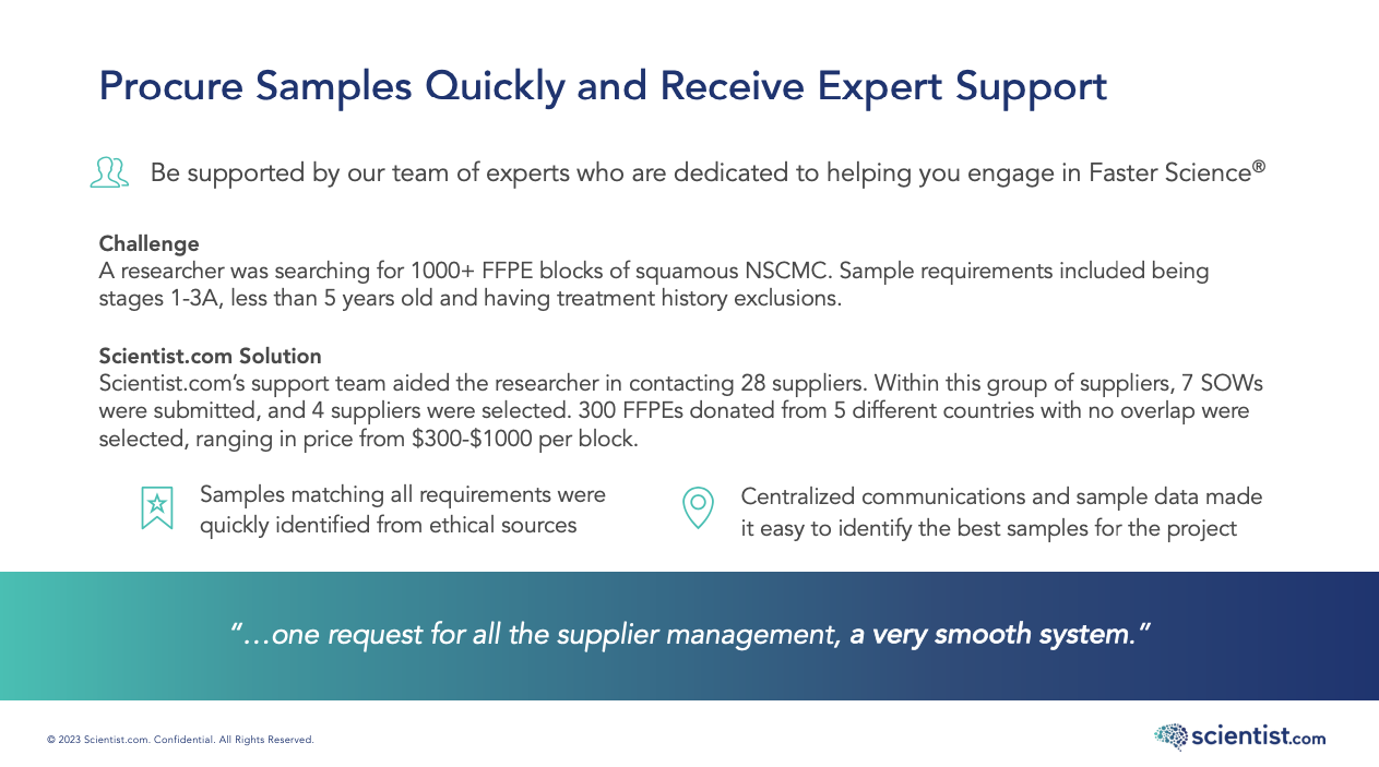 Scientist.com now has over 300 providers of human samples contracted and available to fulfill orders. We have developed a bespoke solution to support organizations who do not have a defined HBS sourcing process established as well as a customizable solution to align with the requirements of clients that already do. This has been used to source over 10 million samples through the platform since 2015, from rare samples to common types across the globe.